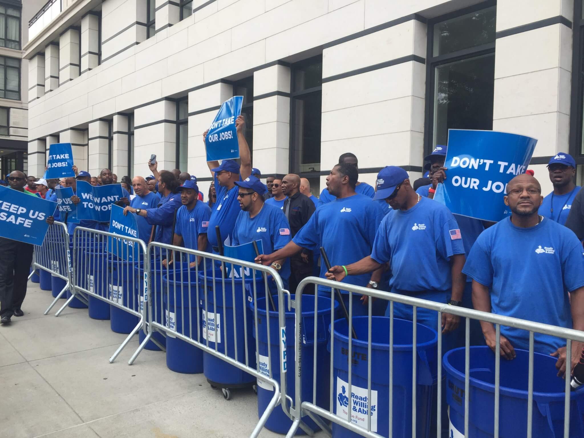 For blocks surrounding Gracie Mansion and Carl Schurz park, the chants of the “men in blue” — as trainees in Ready, Willing & Able are known by millions of New Yorkers whose streets and sidewalks are cleaned through the program — could be heard. “We want to work!” the crowd shouted, “Don’t take our jobs!” This was the second public demonstration in recent weeks by The Doe Fund. The first was held outside DHS Headquarters at 33 Beaver Street in Manhattan. Coverage here.